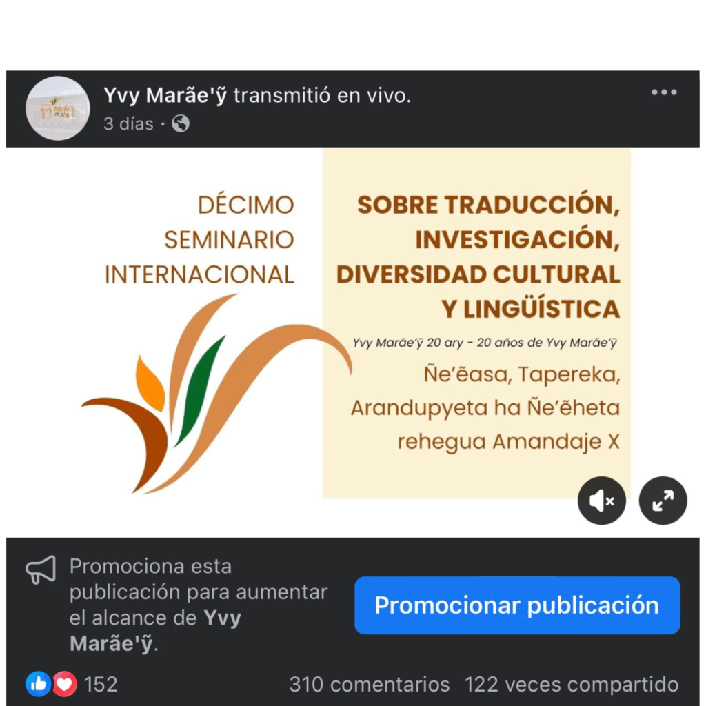 Los días viernes 28 y sábado 29 de noviembre, la Fundación Yvy Marãe’ỹ y el Instituto Técnico Superior de Estudios Culturales y Lingüísticos Yvy Marãe’ỹ realizaron su X Seminario Internacional sobre Traducción, Investigación, Diversidad Cultural y Lingüística «Decenio Internacional de las Lenguas Indígenas» – Ñe’ẽasa, Tapereka, Arandupyheta ha Ñe’ẽheta rehegua Amandaje Oĩhápe Tetãygua ha Pytaygua X «Ypykuéra Ñe’ẽita Yvy Ape Arigua Pa Ary», en el que participarán especialistas de varios países.
